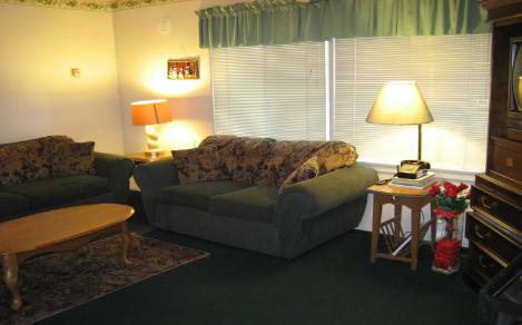 | Timberline Lodge we are pet friendly Cabin 4 — Up to 6 guests Large studio located on the ground floor of a two story building. Features a full bath, 2 queen beds and 2 twin beds, electric fireplace, color cable TV with VCR, direct dial phone, coffee maker, microwave and bar style refrigerator. NO cooking, no fireplace in this cabin. BBQ's are located around the property for your convenience and near the swimming pool with picnic facilities. |